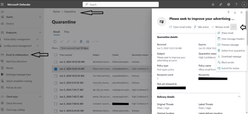 - Go to Email & collaboration >> Review >> Quarantine >> Email Tab: