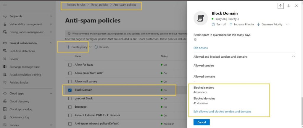 - Edit Policy: Choose the spam filter policy and then click on “Edit”