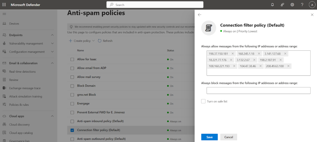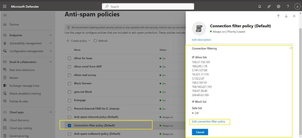 - Blocked IP Addresses: Under “Connection filtering”, add the IP address to the “Blocked IP addresses” list so that Emails from this IP address do not reach your organization users. This is best to prevent Domains owned by known spammers and phishing attackers from around the internet.